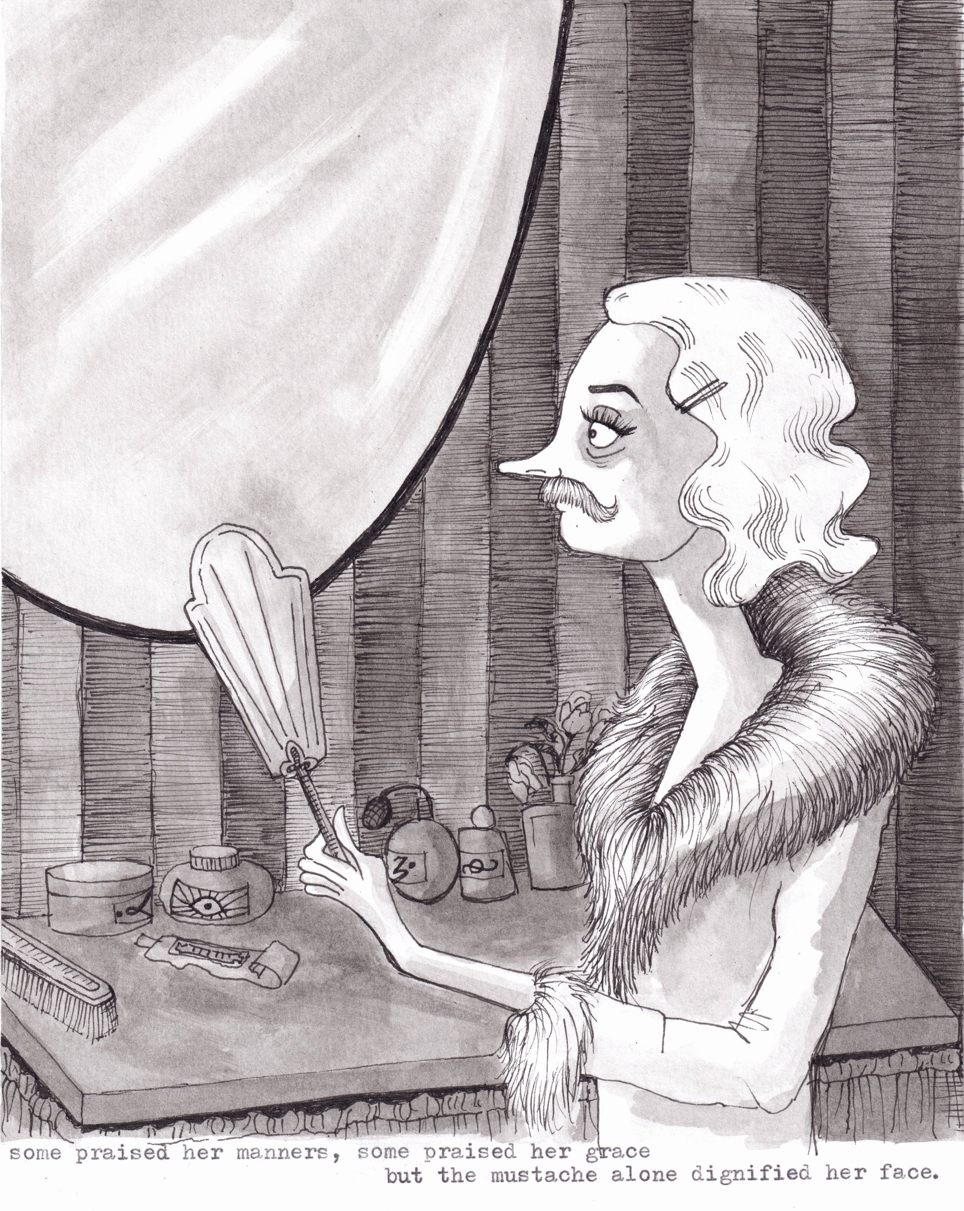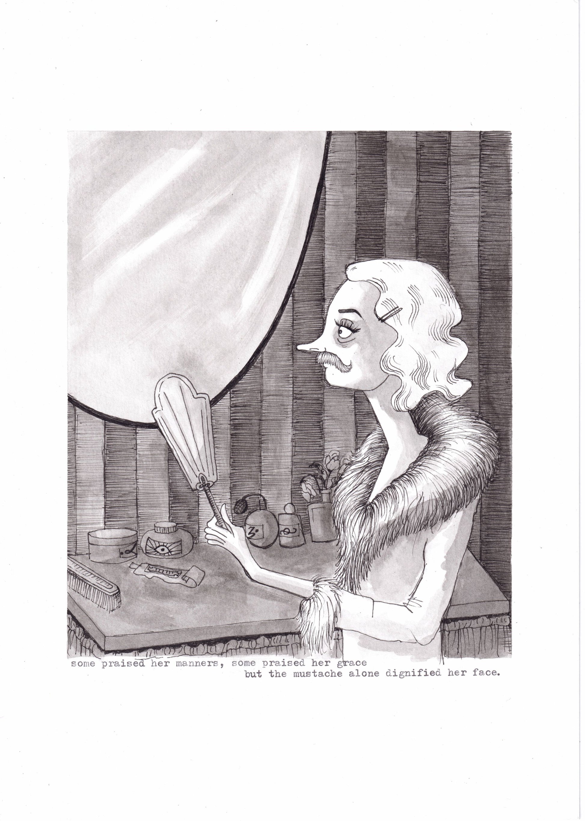 This is the original drawing was created using pen and Indian ink wash on heavyweight paper. It is a unique, hand-rendered piece, not a print or reproduction. Minor scuffs on the white border may be present from the handmade process.
