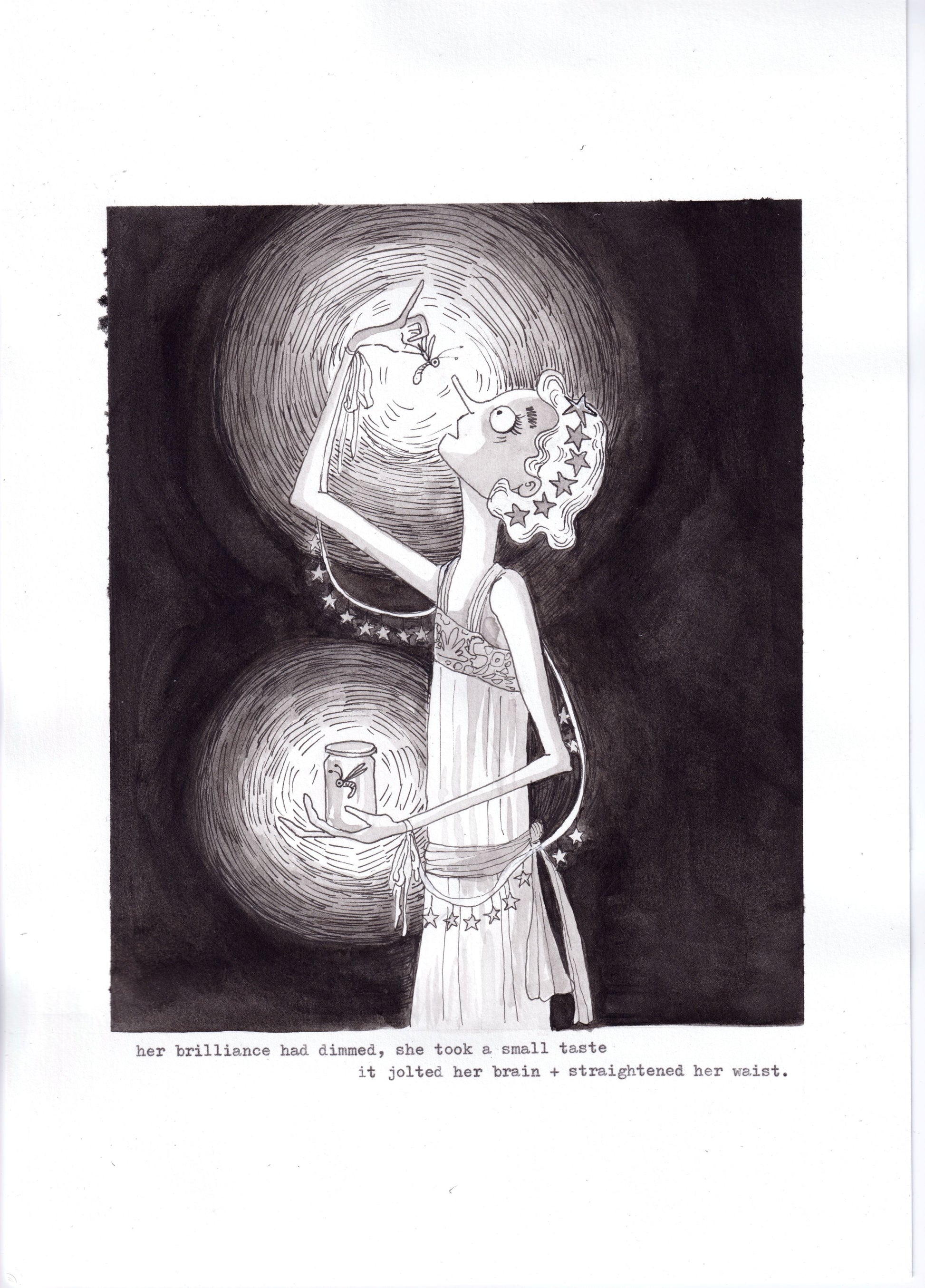 This is the original drawing was created using pen and Indian ink wash on heavyweight paper. It is a unique, hand-rendered piece, not a print or reproduction. Minor scuffs on the white border may be present from the handmade process.
