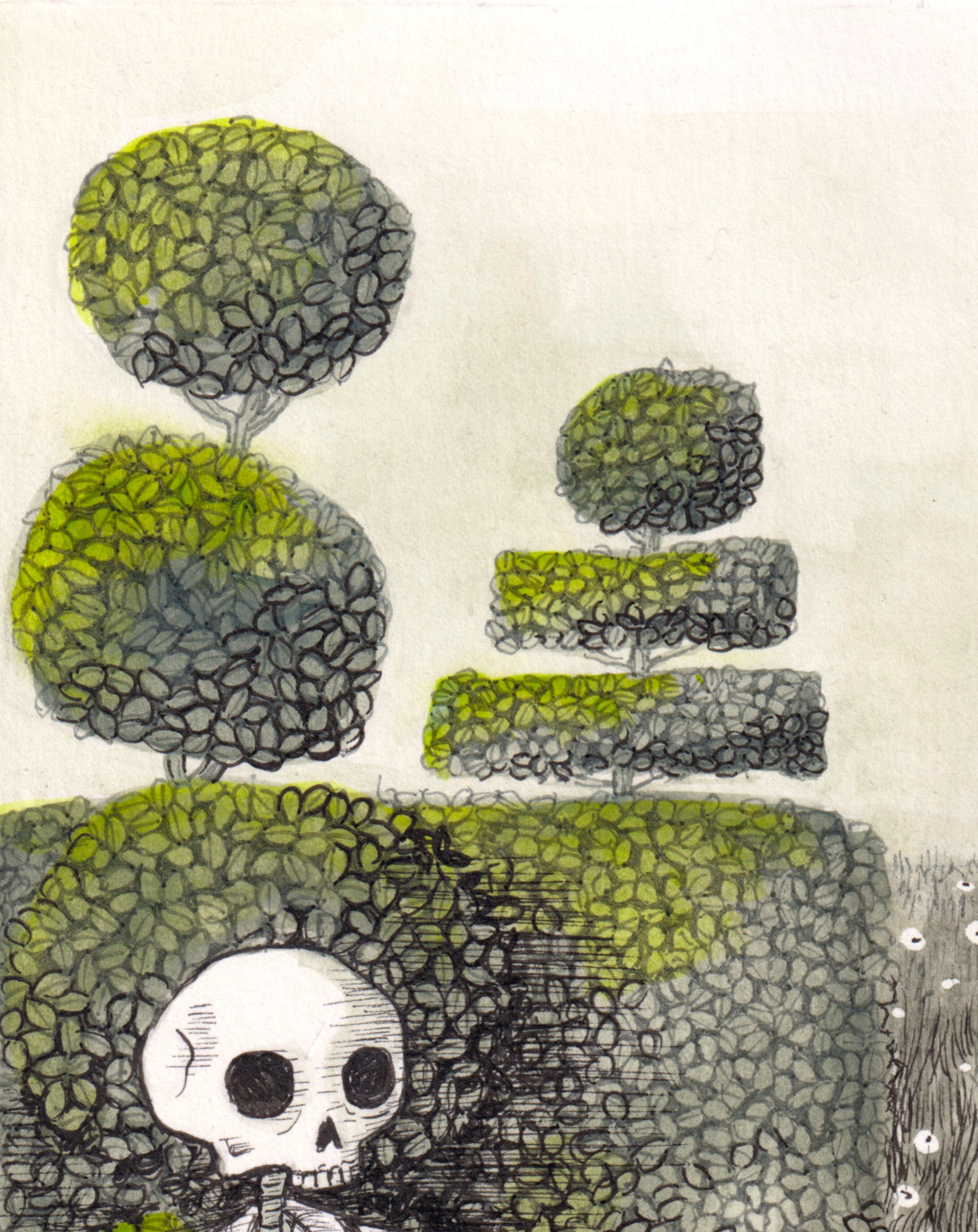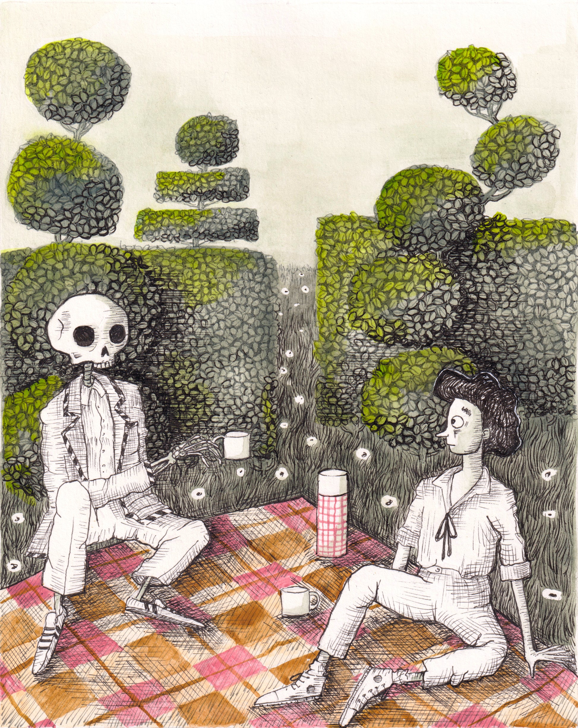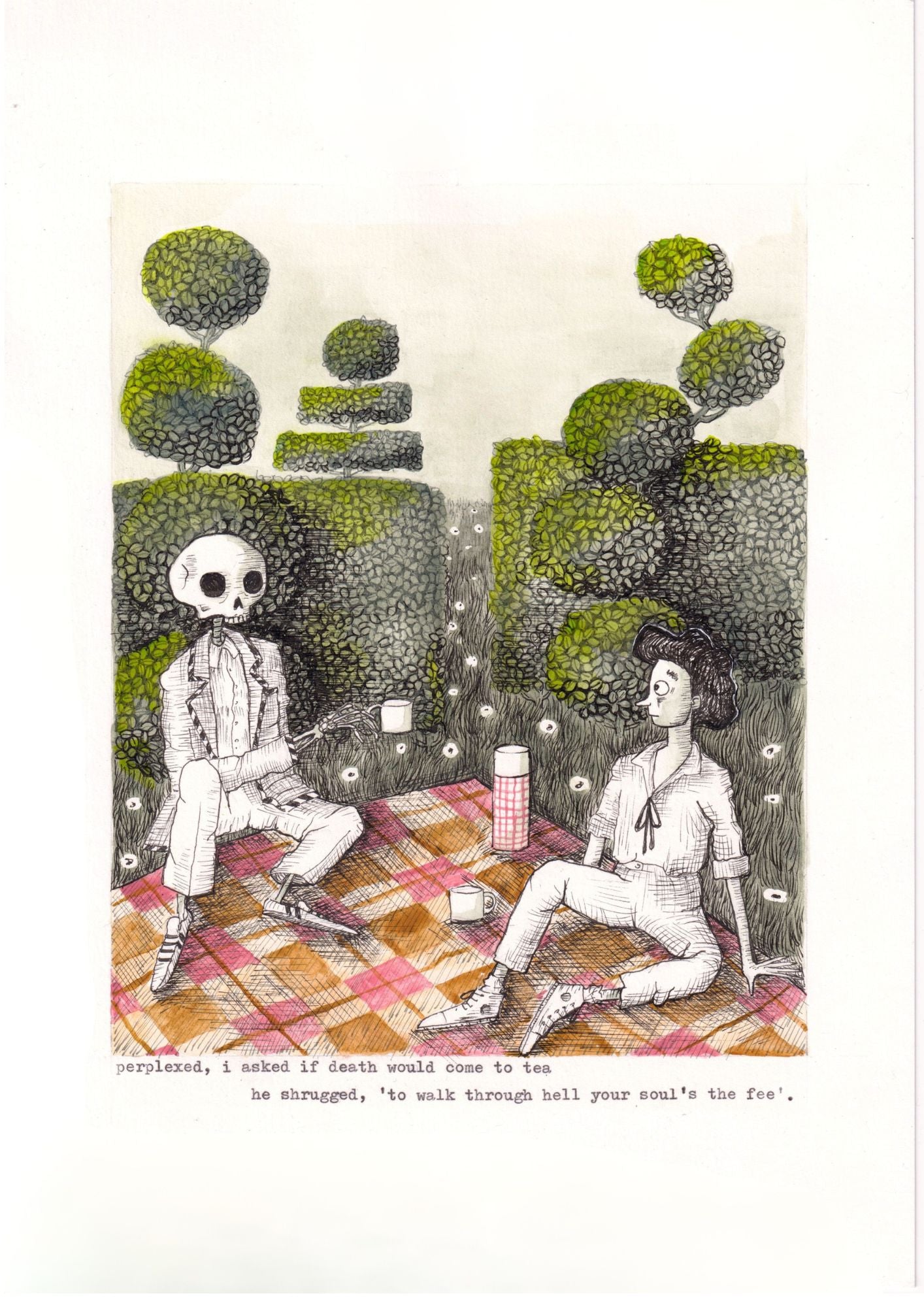 This is the original drawing of "perplexed, i asked if death would come to tea", created using ink and watercolour on heavyweight paper. It is a unique, hand-rendered piece, not a print or reproduction.