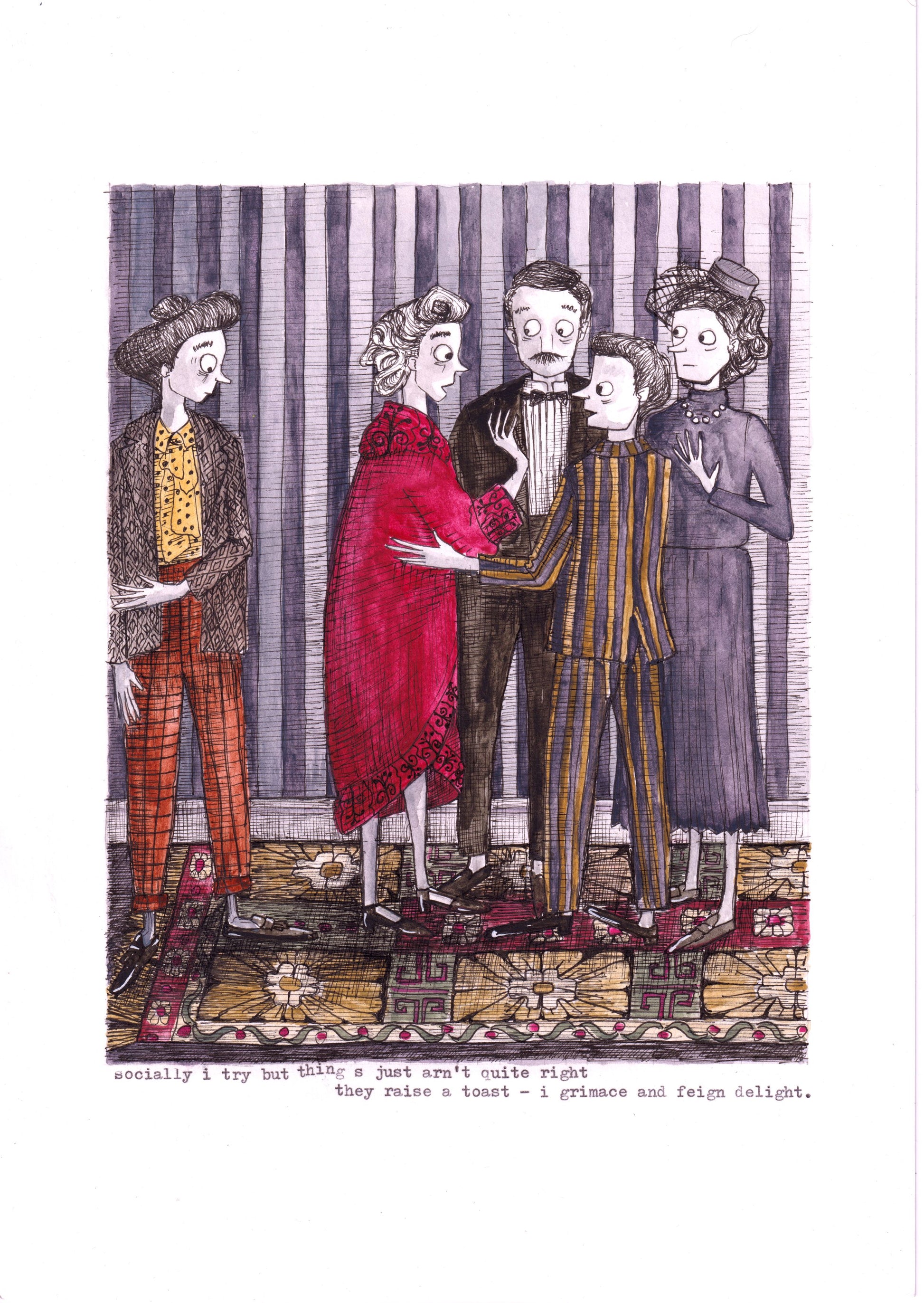 This is the original drawing of "socially i try but things just aren't quite right", created using ink and watercolour on heavyweight paper. It is a unique, hand-rendered piece, not a print or reproduction.