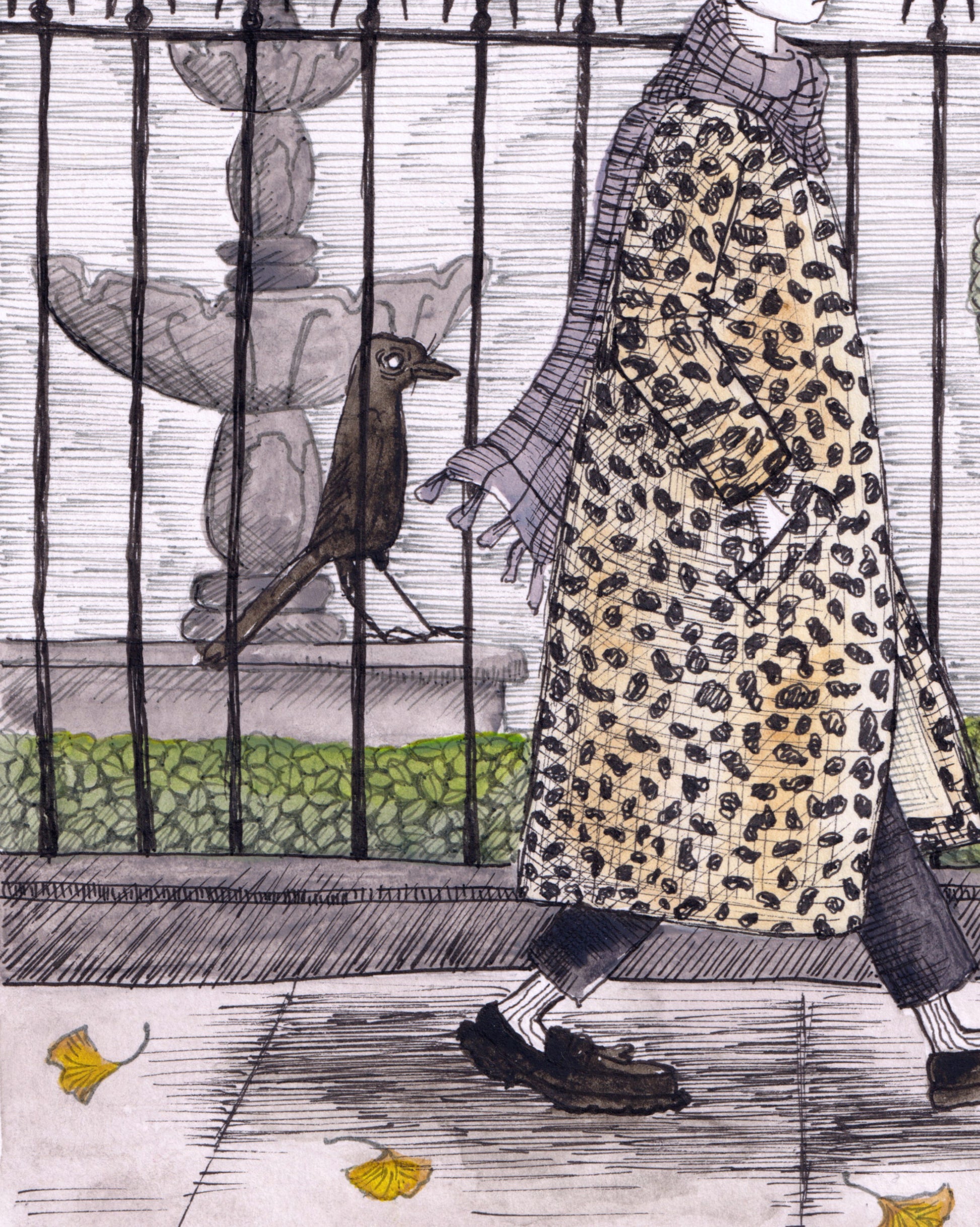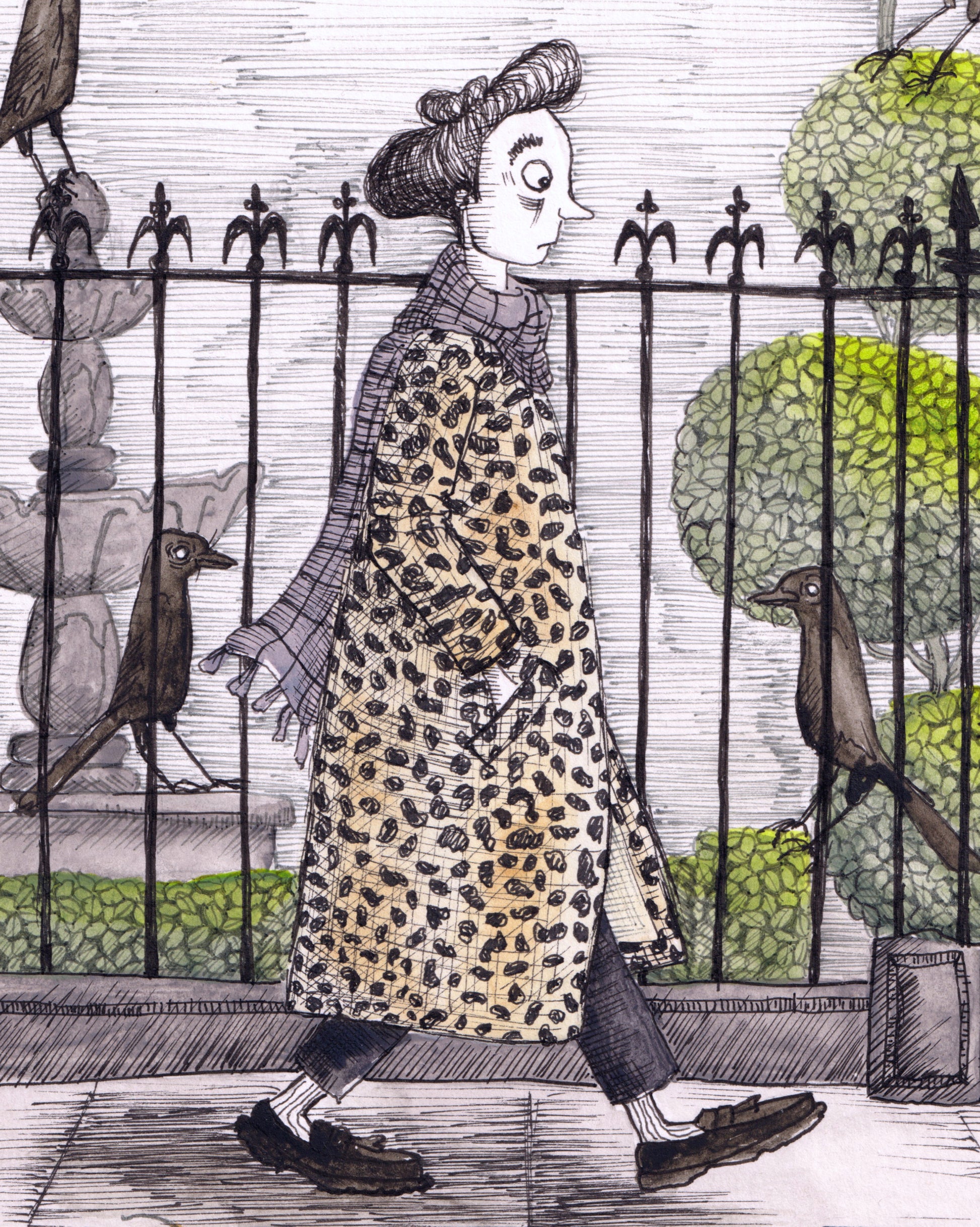 This is the original drawing of "since i got back from hell the crows have not stopped staring", created using ink and watercolour on heavyweight paper. It is a unique, hand-rendered piece, not a print or reproduction.